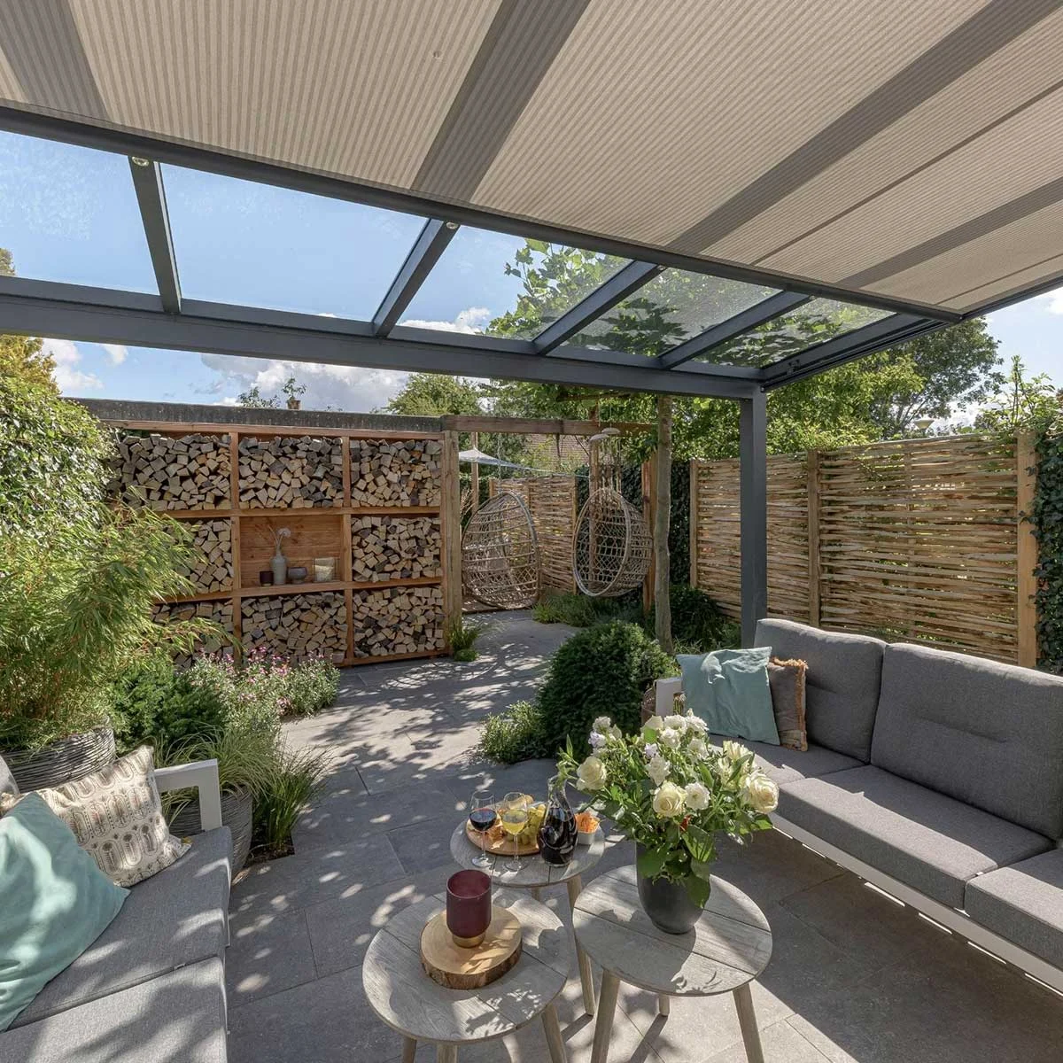 Wilt u het hele jaar door comfortabel buiten zitten? Maak van deze prachtige overkapping een sfeervolle tuinkamer door deze te combineren met de hoogwaardige glasschuifwanden van Verasol. Zo creëert u een flexibele en beschutte buitenruimte die u naar wens kunt openen of afsluiten.