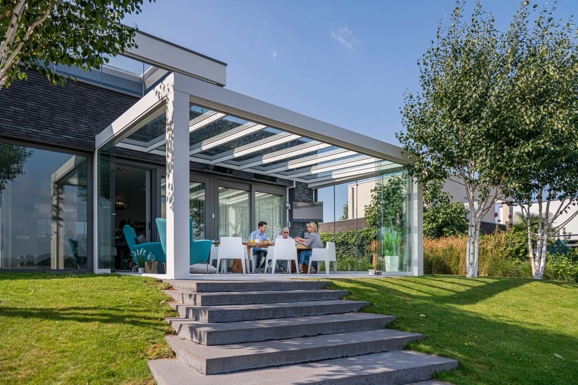 Wilt u het hele jaar door comfortabel buiten zitten? Maak van deze prachtige overkapping een sfeervolle tuinkamer door deze te combineren met de hoogwaardige glasschuifwanden van Verasol. Zo creëert u een flexibele en beschutte buitenruimte die u naar wens kunt openen of afsluiten.