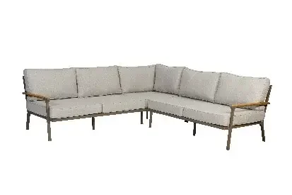 De bankdelen en hocker zijn uitgevoerd met een stevig aluminium frame met champagne poedercoating, gecombineerd met FSC®-gecertificeerde teak armleuningen op de hoekbank. De zit- en rugdelen zijn voorzien van aluminium latten en comfortabele kussens van Olefin buitenstof met fast dry foam vulling, waterdoorlatend, rot- en schimmelvrij. De kussens zijn onderhoudsvriendelijk en geschikt voor langdurig buitengebruik.