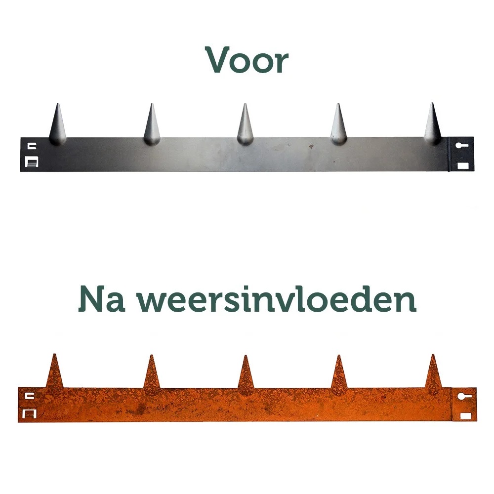 De rand is vervaardigd uit sterk staal en heeft een verzinkte uitstraling bij levering. Na verloop van tijd ontwikkelt het staal een prachtige cortenstaal-look onder invloed van weersomstandigheden. Zo krijgt je tuin een natuurlijke, warme uitstraling terwijl de rand zijn robuuste kwaliteit behoudt.